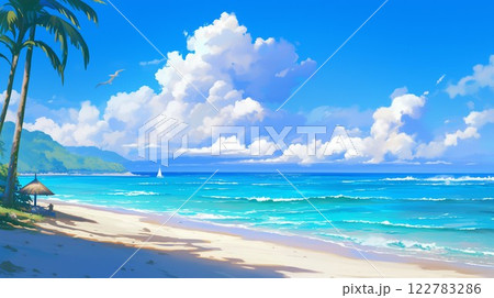 綺麗な砂浜と海の背景イラスト、素材、夏、人物なし、ビーチ、無人風景