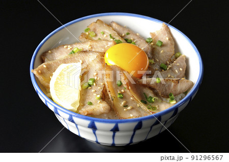 カットレモンと卵黄が乗った熱々豚トロ丼、焼き肉丼を黒背景で撮影