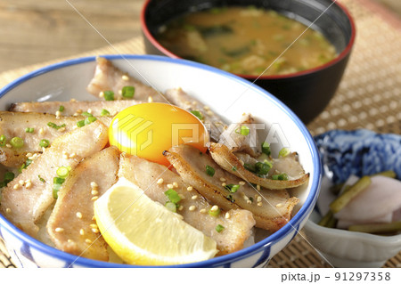 カットレモンと卵黄が乗った豚トロ丼、焼き肉丼を白背景で撮影