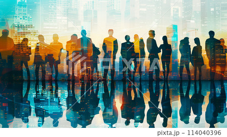 Cooperation gesture, success with double exposure of business people and network interface. Concept of connection and partnership.