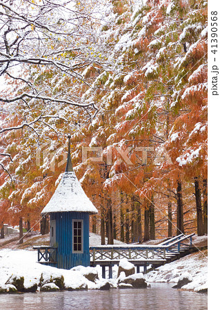 紅葉のあけぼのこどもの森公園 池の上の青い建物と黄色いメタセコイア