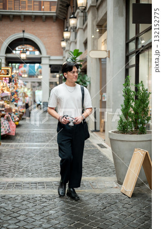 Asian man with glasses in white tee is smiling while taking photos on camera in shopping mall or market.