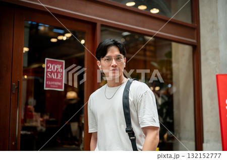 Asian man wearing glasses in white tee looking into camera in front of a shop in shopping mall.