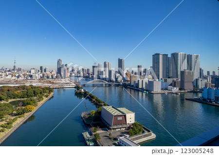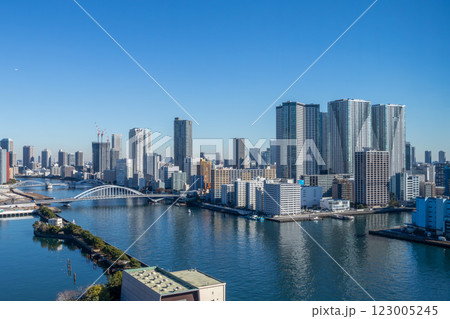 日本の東京都市景観 タワーマンション群や豊洲大橋などを望む