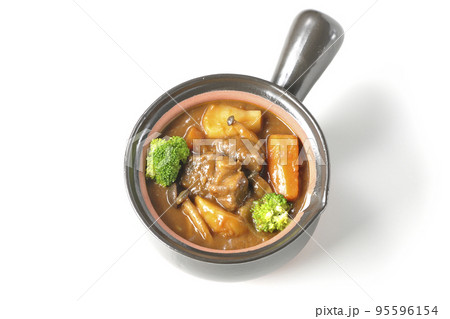 お鍋にブロッコリーや人参、しめじなど沢山の具材が入っているビーフシチューを白背景で撮影