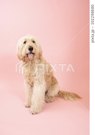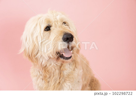 ピンクバックと笑顔でお座りしたゴールデンドゥードルのバストアップ