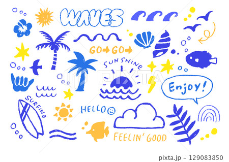 手描き風サーフィンと夏モチーフイラストセット|波・ヤシの木・太陽・貝殻・フィーリングポップアート