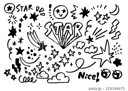手描き風の黒い線で描かれた星やスパークルが散りばめられたシンプルで可愛い落書きイラストセット