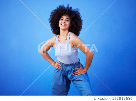 Fashion, natural hair and black woman isolated on a blue background for gen z, youth or cool portrait with mockup. Afro person or beautiful model with style, confidence and happy in studio space