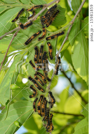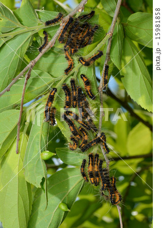 生き物 昆虫 チャドクガ、行儀よく並んで食事中の幼虫。注意して手早く駆除しないと大変なことに・・・