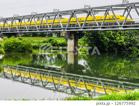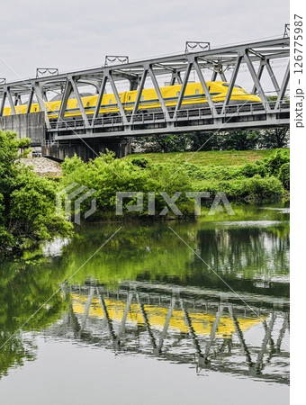 ドクターイエロー桂川橋梁を通過 桂川にリフレクション
