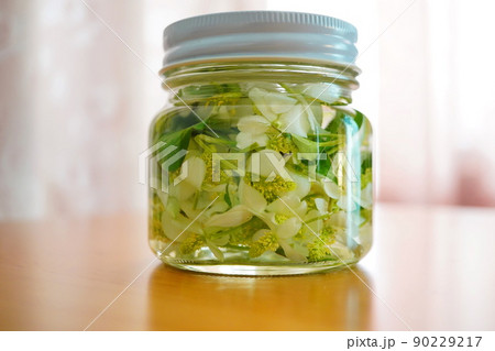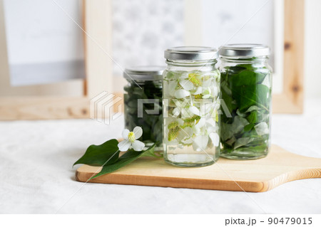 アルコールに漬けたばかりの瓶詰めの美しいドクダミの花チンキ化粧水、クローズアップ