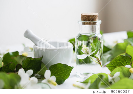 白背景に生薬であるドクダミの葉と花を飾った瓶に詰めたばかりのどくだみの花のハーブティンクチャー