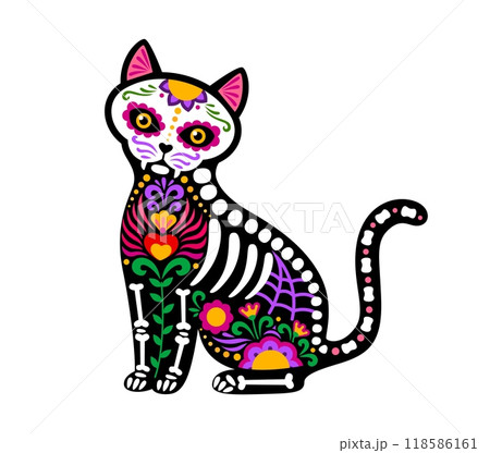 Day of the dead Mexican cat animal skeleton tattoo. Isolated cartoon vector dia de los Muertos feline kitten pet sugar skull, featuring colorful floral alebrije patterns and vibrant skeletal details