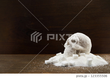 Sugar cubes arranged in the shape of a skull symbolize the health risks associated with excessive sugar intake, highlighting the importance of a low sugar lifestyle for overall well being