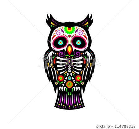 Mexican owl bird tattoo with skull, skeleton bones and floral ornament, vector symbol. Day of Dead, Dia de Los Muertos, Mexican fiesta and Halloween holiday decoration of skeleton owl for tattoo