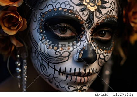 Day of the Dead. Close-up portrait of a beautiful woman with sugar skull makeup.