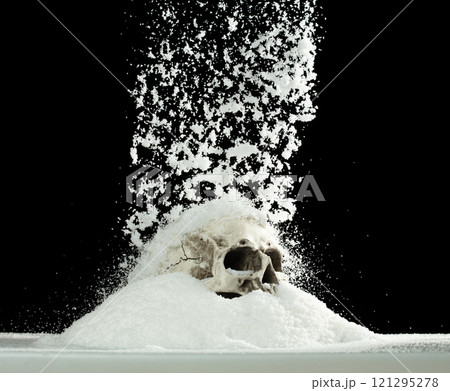 Human Skull was covered by white snow ice for long year winter. Snow fall and wind blow to skull over night black background isolated