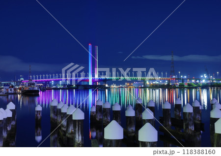 オーストラリアメルボルンのドックランズから見たカラフルにライトアップされた橋