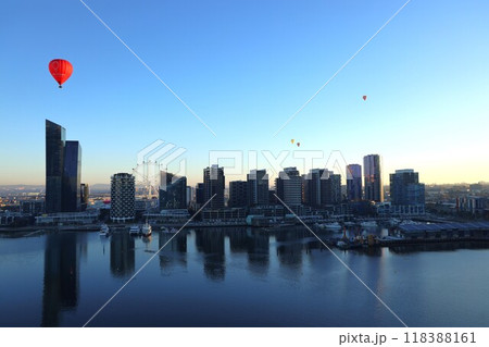 オーストラリアメルボルンのドックランズハーバーに気球が浮かぶ美しい風景