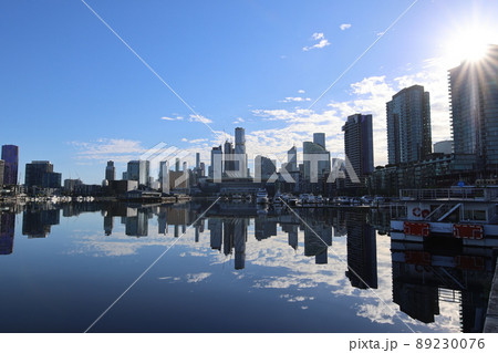 晴れた青空の水面に反射するオーストラリアメルボルンドックランズのビル群