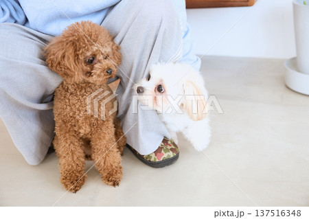 飼い主を見上げるトイプードルとマルチーズ 犬のいる暮らし