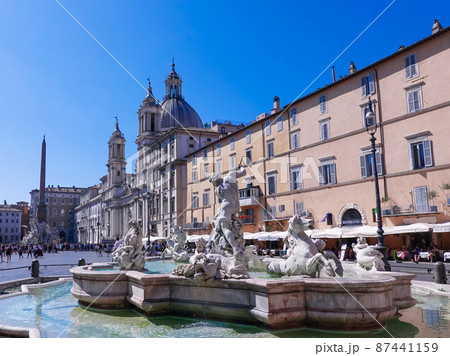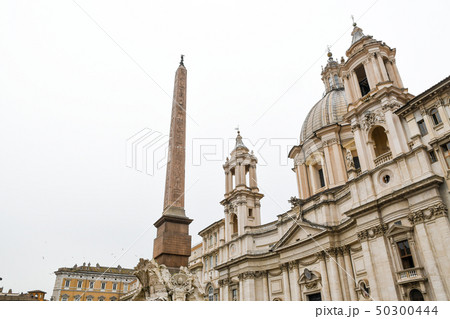 ナボーナ広場 四大河の噴水(アゴナリス・オベリスク)と教会(ローマ、イタリア)