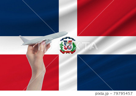 Airplane in hand with national flag of Dominican Republic Travel to Dominican Republic