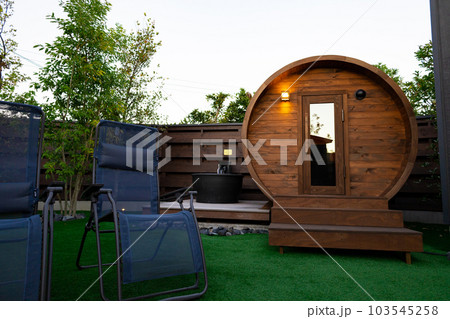 お洒落なプライベートの木製バレルサウナ・ドライサウナと水風呂、ととのうチェア(東京都)