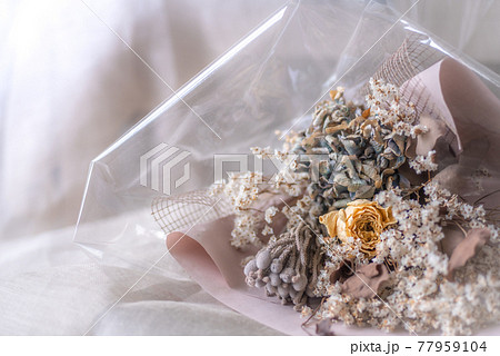 可愛いドライフラワーの花束、ナチュラルな雰囲気、ボタニカルなシーン
