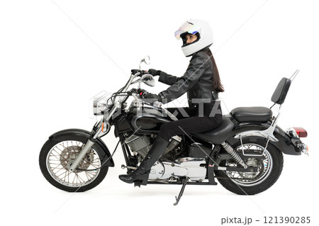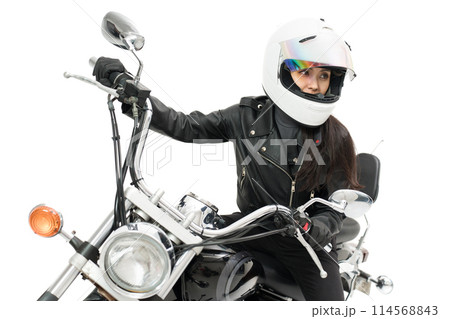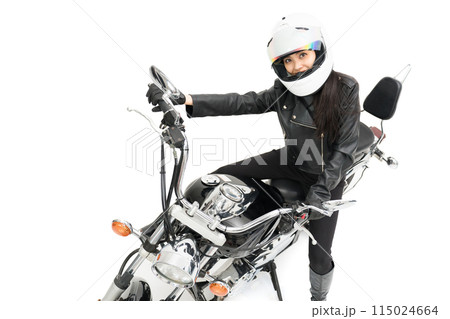 レザージャケットを着てバイクに座ってヘルメットを持つバイク女子