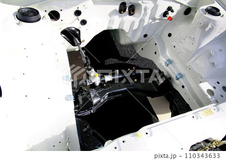ホワイトボディ状態のAE86(ハチロク)… エンジンが降ろされたエンジンルームとメインバー
