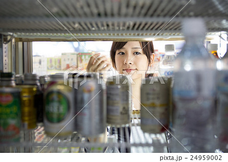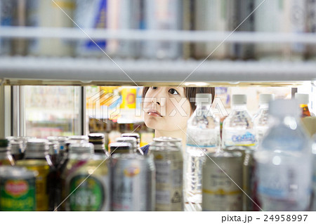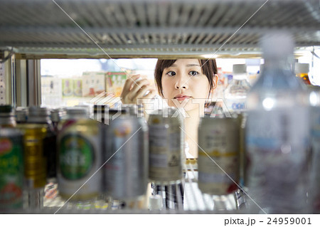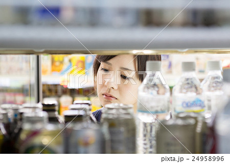 ドリンクコーナーの冷蔵庫からミネラルウォーターを取り出す若い女性客