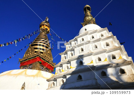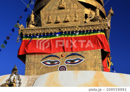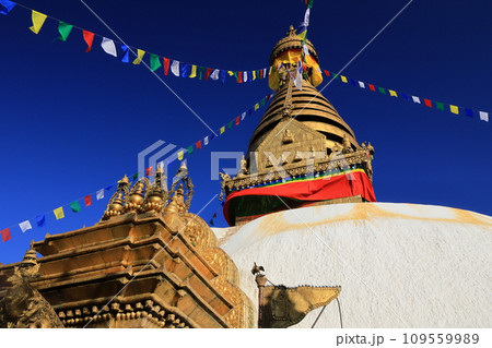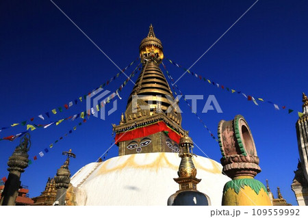 ネパール、カトマンズ、スワヤンブナート、ストゥーパ、タルチョ(五色の祈願旗)巨大なドルジェ(金剛杵)