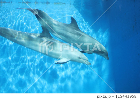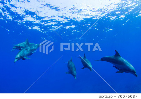 澄んだ海中を泳ぐ野生のイルカ達
