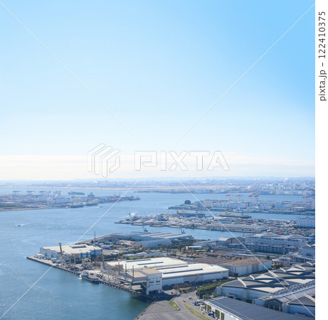 港湾都市と青空のドローン空撮