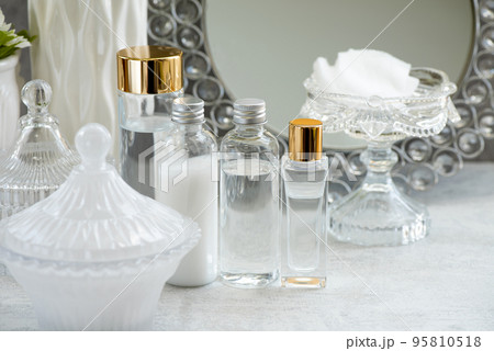 スキンケア化粧品とコットンとガラス小物を鏡の前に並べた肌のお手入れイメージ
