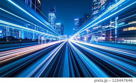 Futuristic tram with an aerodynamic design, illuminated by neon lights of a large city