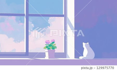 窓辺で眠る白猫と紫の花のやさしいイラスト