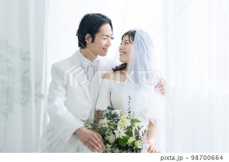 結婚式で結婚式場の庭でブーケを持つ新郎新婦(ガーデンウェディング)