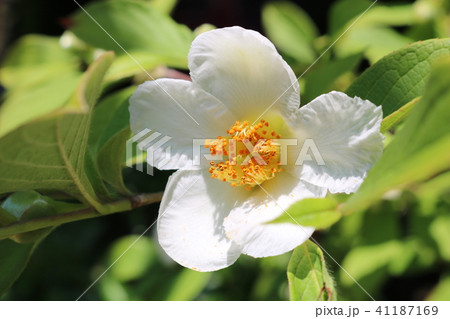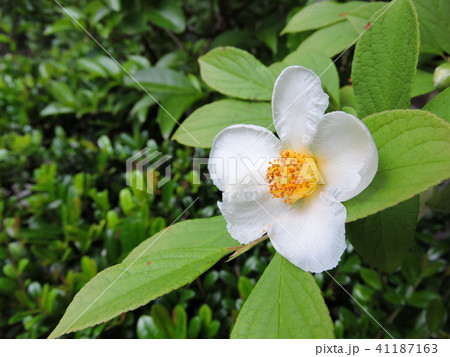 夏から梅雨の頃、緑の葉のわきに白い五弁花が涼しげに咲く。ナツツバキは「愛らしい」が花言葉だ。