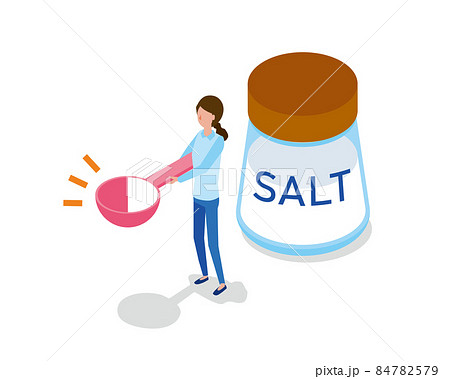 減らした塩をもつ女性の減塩イメージのアイソメトリックイラスト