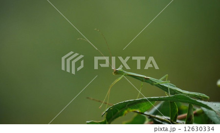緑の葉にとまる小さいナナフシ