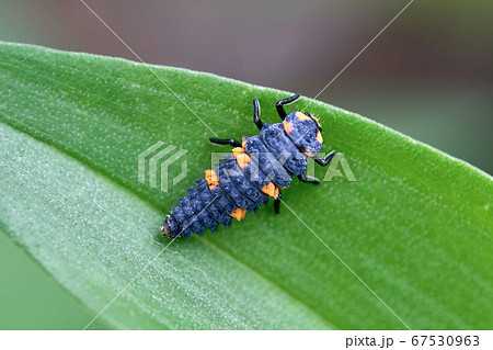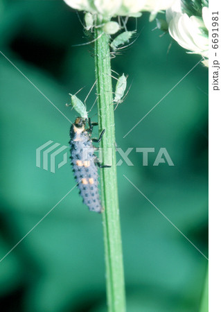 アブラムシを捕食するナナホシテントウムシの幼虫