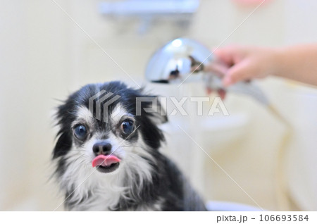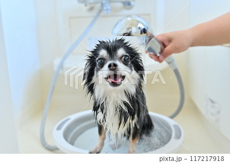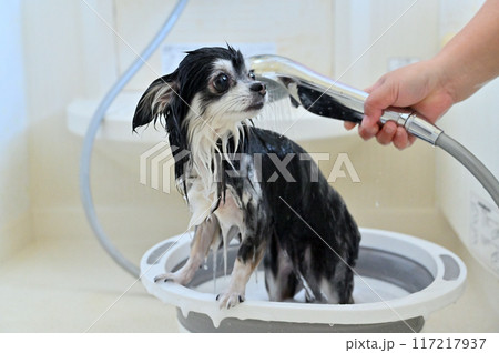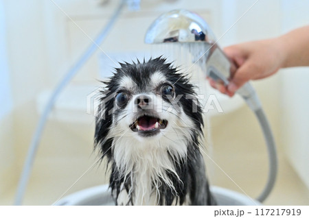 マイクロバブル、ナノバブルのシャワーヘッドでグルーミングをするチワワ