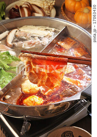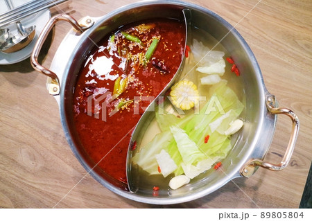 裝有麻辣和養生兩種湯底的鴛鴦火鍋