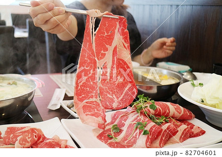 一個人夾起了比臉還大、新鮮紅嫩的火鍋肉片