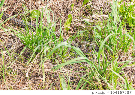 川岸の枯れ草の上で日光浴をするシマヘビ