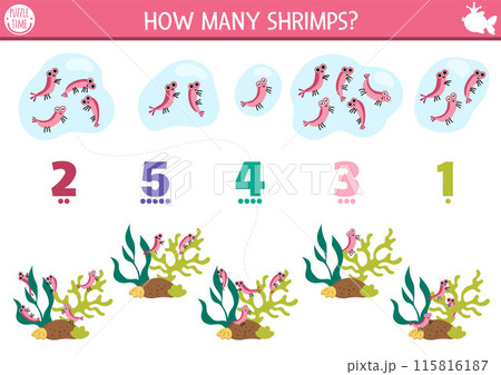 Match the numbers mermaid game with shrimps in the seaweeds. Fairytale ocean kingdom math activity for preschool kids. Marine educational counting worksheet with sea animals