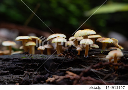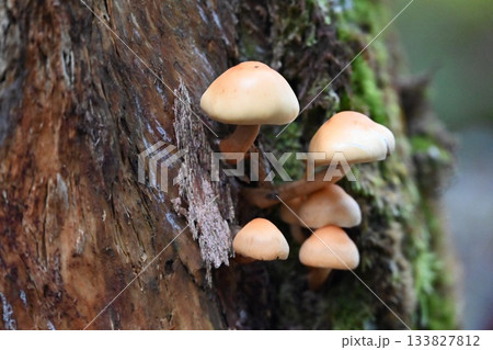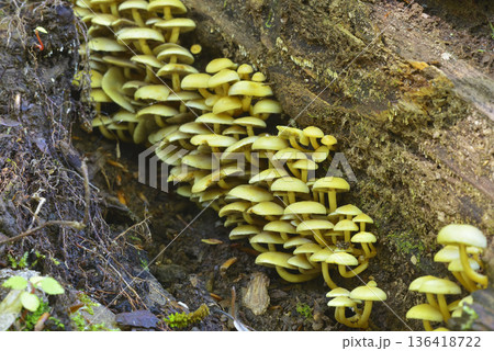 ニガクリタケ 朽木の割れ目にキノコが密生している。